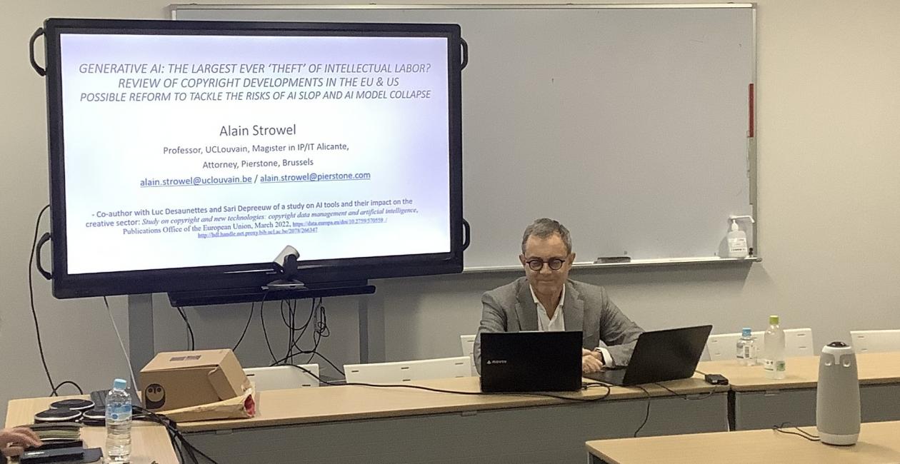 Professor Strowel opened his presentation by illustrating the profound impacts of generative AI on the creative sector, emphasizing the widespread use of copyrighted works for AI training and how this practice might contribute to a “theft of intellectual labor”. He highlighted significant risks, including legal uncertainties, the proliferation of “AI slop” and the threat of “AI model collapse” if models are trained mainly on synthetic data.