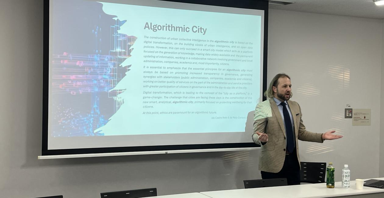 The lecture explored the transformative impact of artificial intelligence and digital infrastructures on contemporary urban governance. Professor Sokołowski opened his presentation by explaining how rapid urban digitalization is reshaping cities into what he described as “algorithmic cities.” These are complex ecosystems in which AI systems, automated decision-making, and data-driven technologies increasingly regulate public services, mobility, housing, energy distribution, and civic administration. He emphasized that this evolution goes beyond the traditional “smart city” paradigm and signals a deeper structural transformation of urban life.